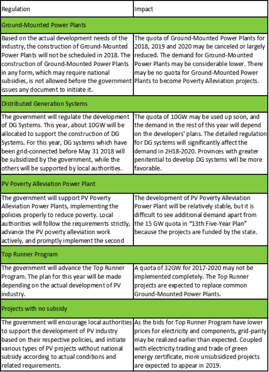 The notification has lowered the national PV feed-in tariff (FiT) for the quota of 2018. Particularly, FiT for both Ground-Mounted Power Plant and Distributed Generation (DG) System dropped by RMB 0.05/kWh, but there is no change to the subsidy for PV Poverty Alleviation Power Plant (Village), of which the FiT remains RMB 0.42/kWh.