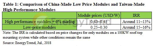 On the other hand, the prices of high-performance modules should be reduced to USD$0.36/W in order to increase IRR to 15~16%. For modules makers, this price level is almost impossible as they need to make profits and cover the high costs of qualification by BSMI. In the situation, Chinese low price modules, even without the 6% FiT premium, turn out to more competitive than Taiwan-made ones.