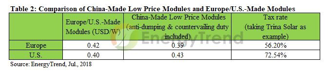 As for the European markets, taking Trina Solar as an example, if the selloff price is USD$0.25/W, the market price of modules would be USD$0.39/W, 56.2% of anti-dumping and countervailing duty included. This market price would still be lower than other products in the European markets. In the case of U.S. market, where the duty is 72.54%, the market price would be USD$0.43/W, almost the same as other products in the U.S. market, but the Chinese modules would still be marginally competitive.