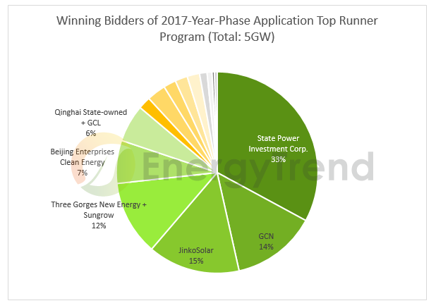 In the Application Top Runner Program of 2017, there were quite a number of consortiums. According to these consortiums' stock composition, the successful bidders are listed in the pie chart below. (Note: Each of the following two consortiums was awarded jointly within its two companies. Therefore, bids won by these two consortiums were not listed separately: China Three Gorges New Energy Co., Ltd. plus Sungrow Power Supply Co., Ltd., and Qinghai State-owned Assets Investment & Management Co., Ltd. plus Golden Concord Group Limited. (GCL)).