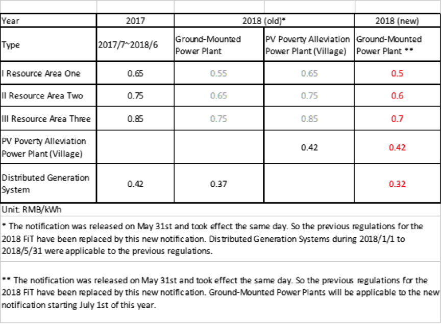 The notification has lowered the national PV feed-in tariff (FiT) for the quota of 2018. Particularly, FiT for both Ground-Mounted Power Plant and Distributed Generation (DG) System dropped by RMB 0.05/kWh, but there is no change to the subsidy for PV Poverty Alleviation Power Plant (Village), of which the FiT remains RMB 0.42/kWh.