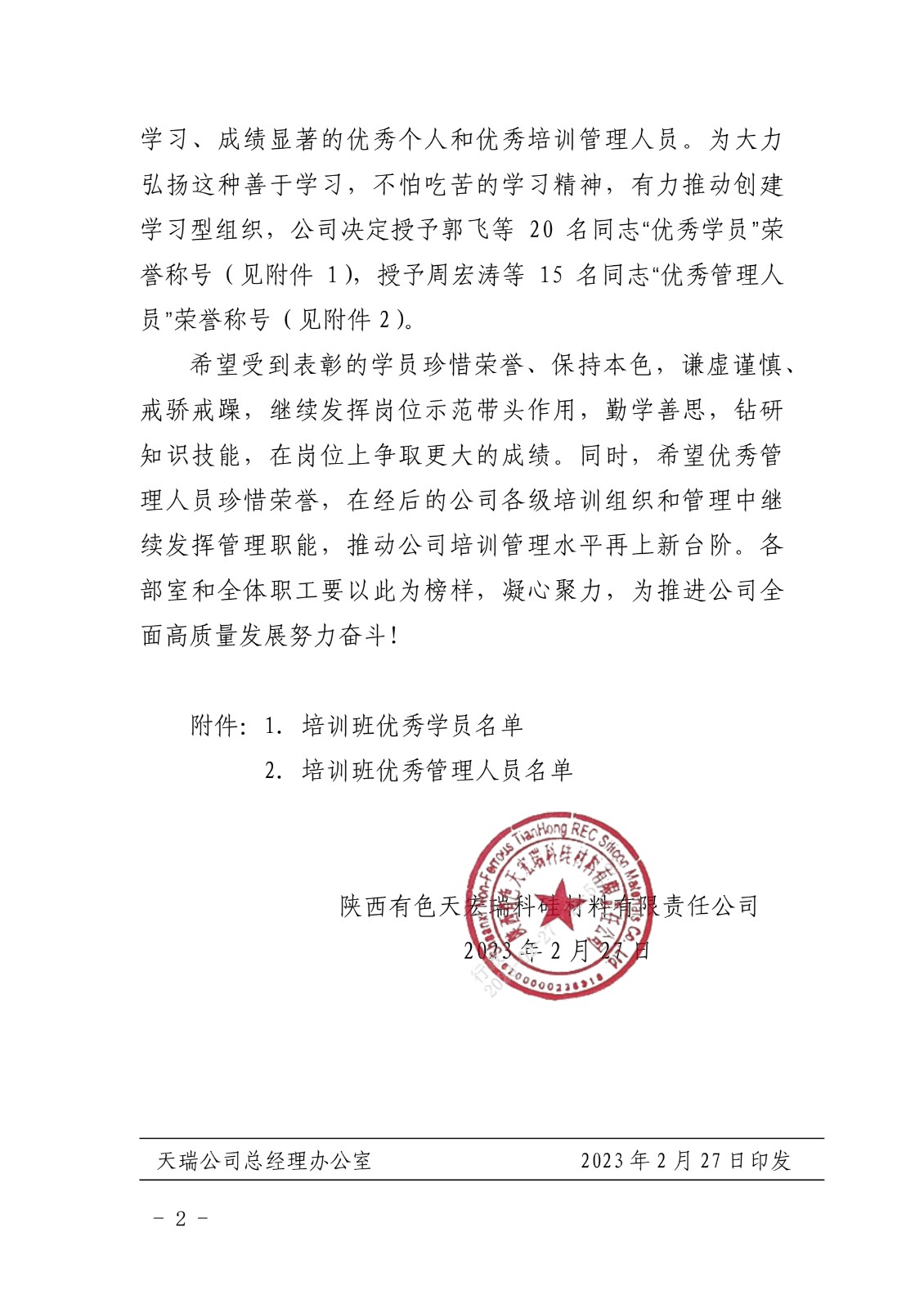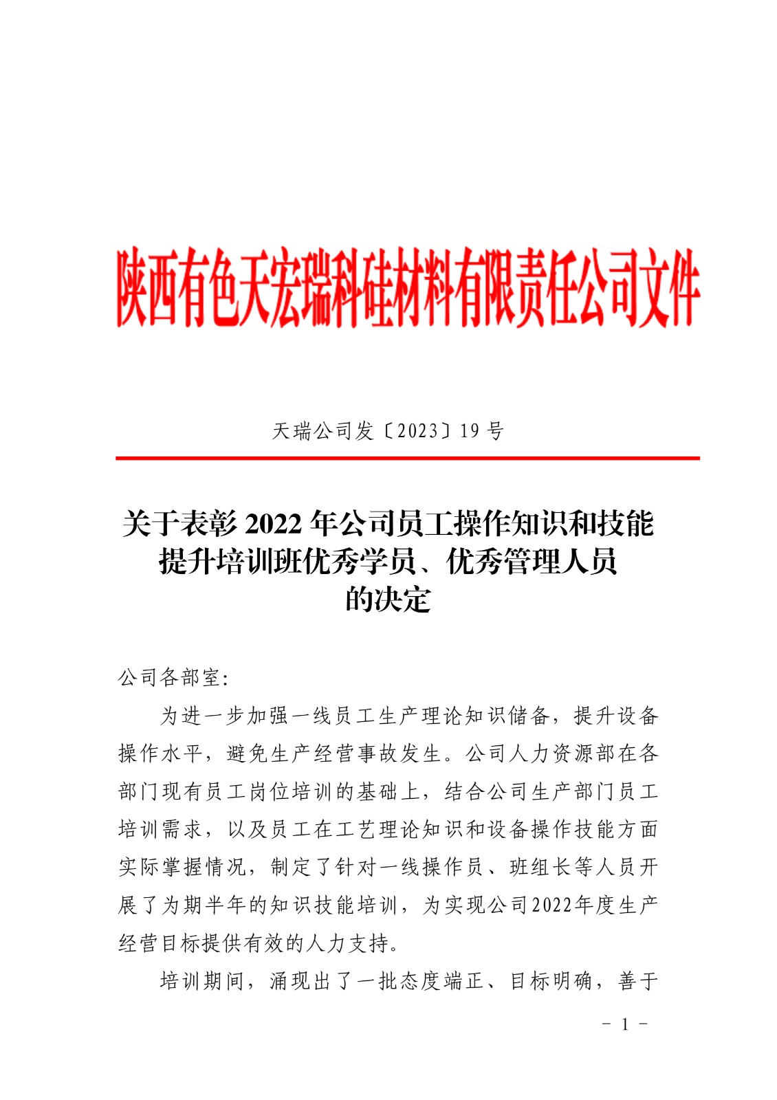 关于表彰 2022 年公司员工操作知识和技能提升培训班优秀学员、优秀管理人员的决定