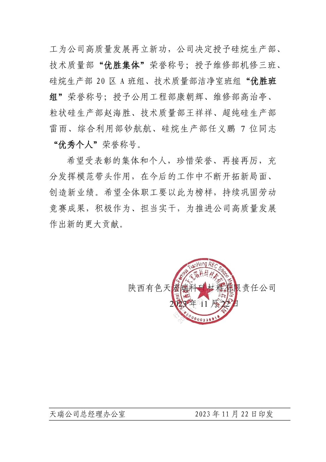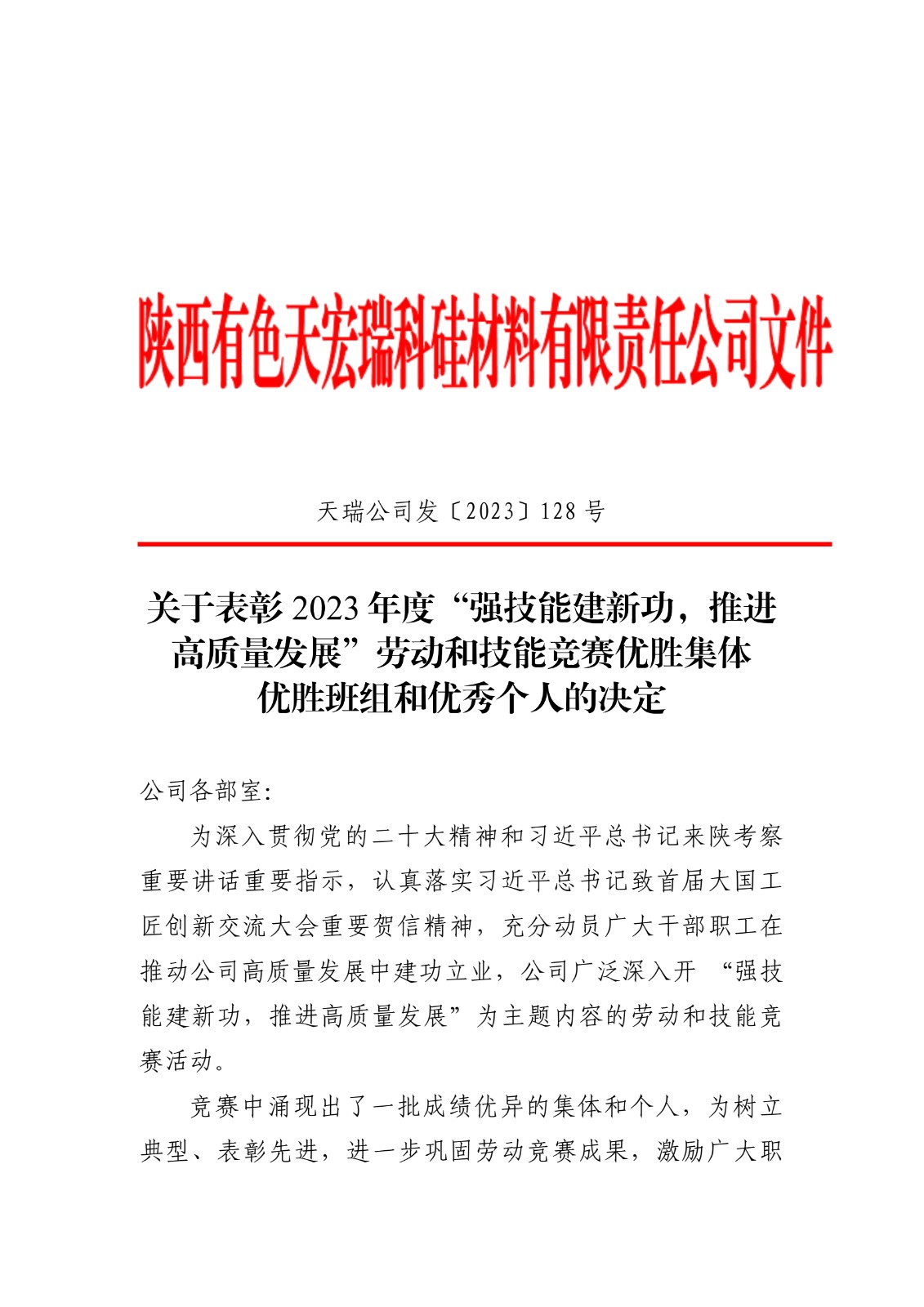 关于表彰 2023 年度“强技能建新功, 推进高质量发展”劳动和技能竞赛优胜集体 优胜班组和优秀个人的决定